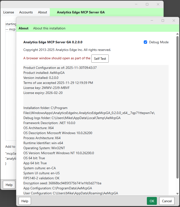 Opening the About wizard will show your some details about the MCP server installation. Share this information with support if you have a problem. The ‘self test’ will open a browser window that you can close — it tests a critical function of the account login process.