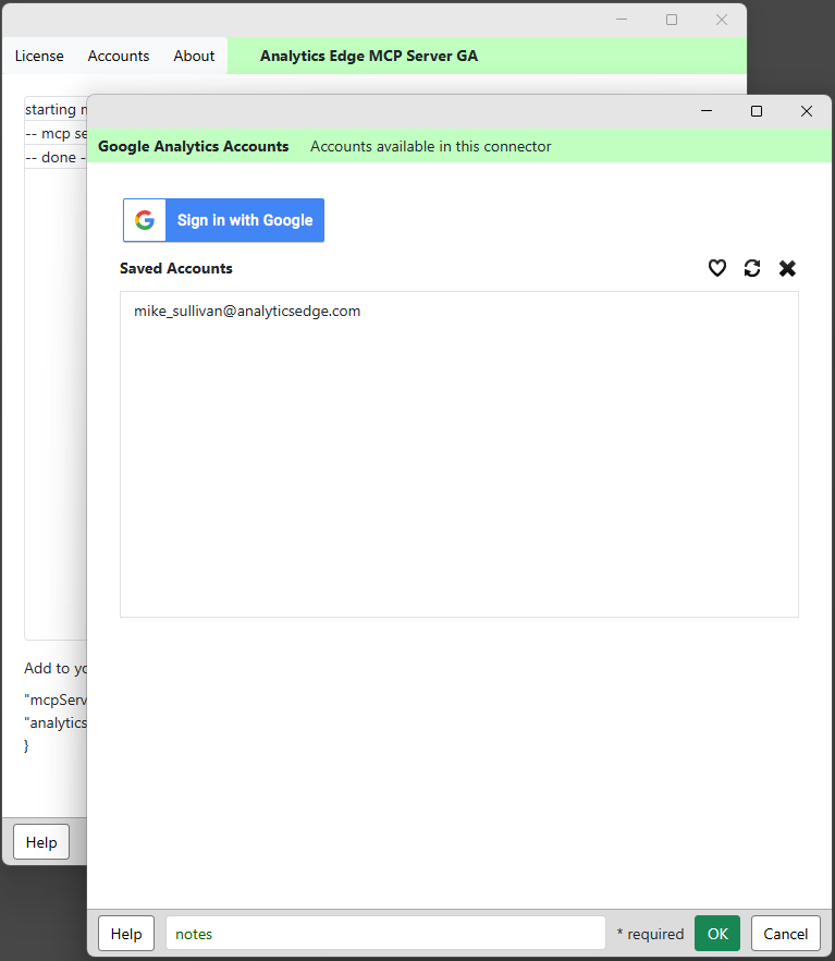 Click the Sign in with Google button to login and add a new account (similar to the initial setup login process). There are no account limits in Analytics Edge products.